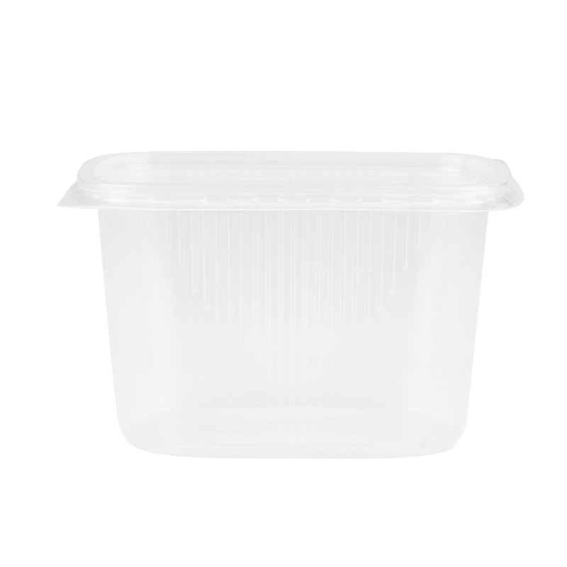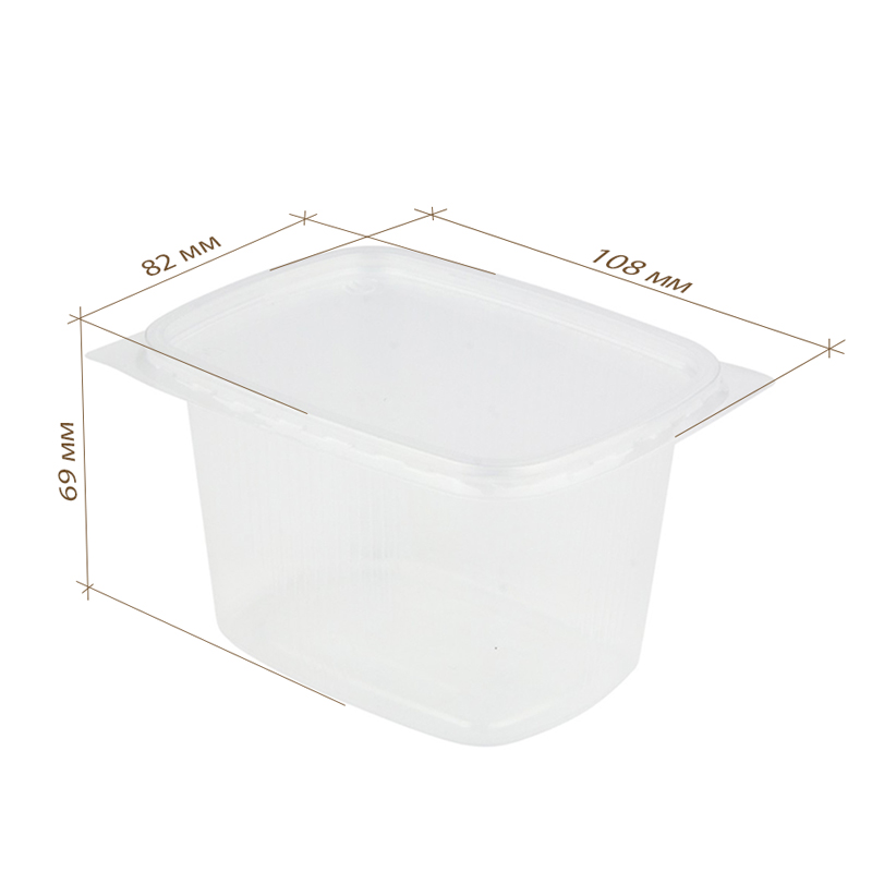 Контейнер одноразовый применяется в заведениях фаст-фуда, в заведениях торгующих едой на вынос, предприятиях, торгующих полуфабрикатами. Изготовлен из прозрачного полипропилена. Поставляется без крышки. Объем 350 мл, размер 108х82х69 мм.